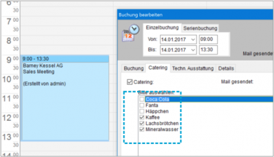 يمكن حجز المشروبات والطعام بشكل فردي لكل مؤتمر بنقرة على الفأرة. يتم النقل إلى تقديم الطعام تلقائيًا عبر البريد الإلكتروني. سيتم إعادة إرسال التغييرات على الطلبات تلقائيًا.