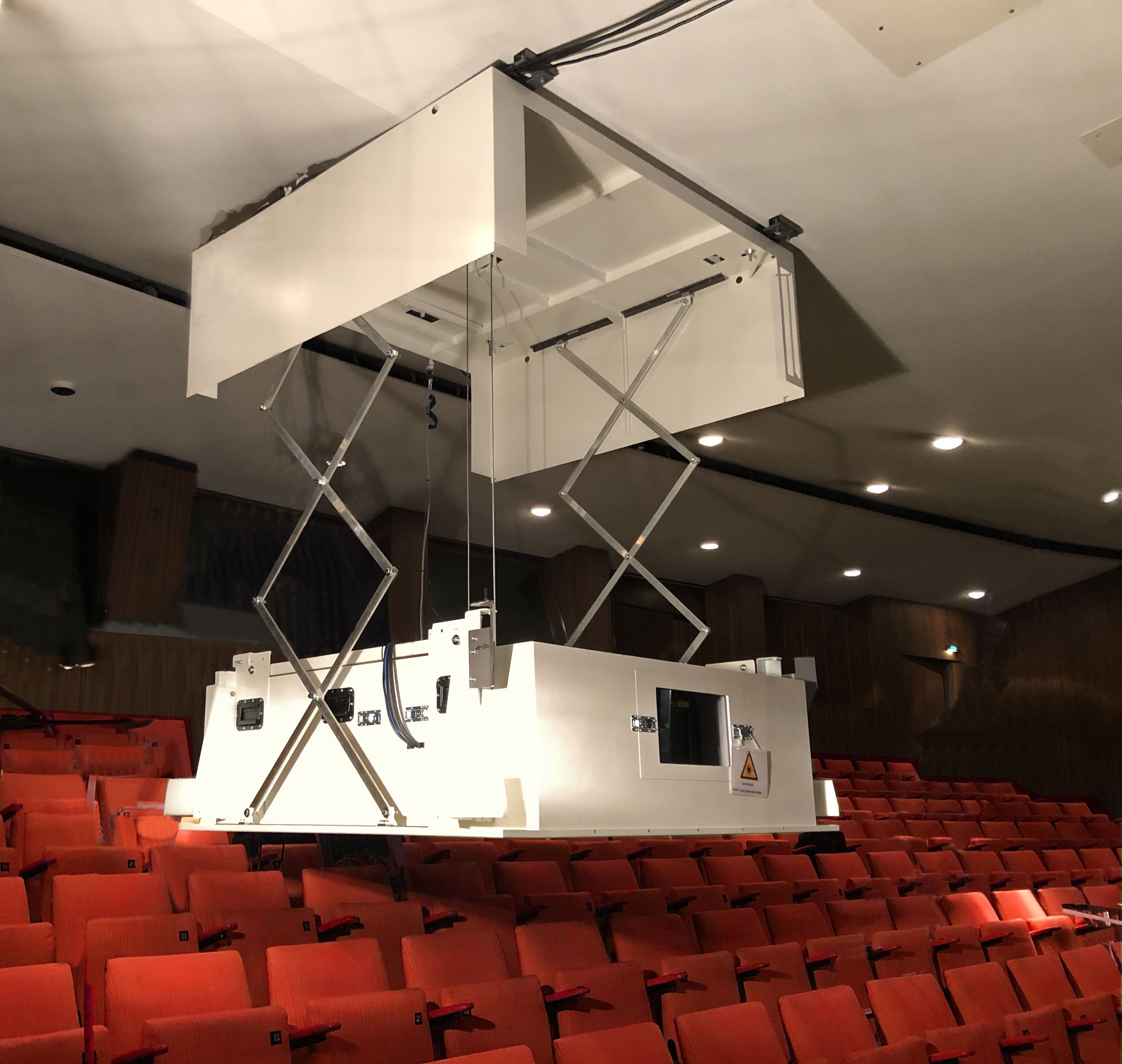 Mit dem Power-Lift ist es nun problemlos möglich eine integrierte, platzsparende und praktikable Lösung zu installieren. Der Projektor samt Schallschutzgehäuse verschwindet in der Decke, die leichte Zugänglichkeit für Wartung und Service ist durch das Herunterfahren der kompletten Einheit möglich.