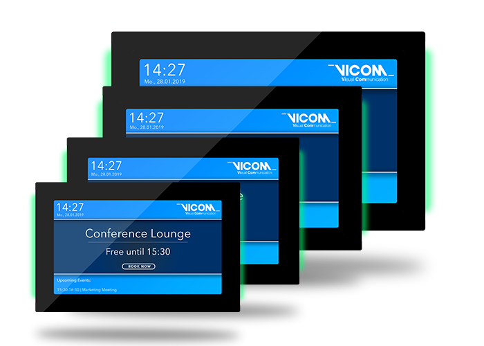 Das schlanke und moderne Design wirkt vor jedem Konferenzraum sehr progressiv. Integrierte LEDs lassen einen roten oder grünen Leuchtrahmen um das Display erscheinen, was die Attraktivität und den Raum-status schon aus der Ferne sichtbar macht. Andere Farben z.B. im Rahmen des CI können mit dem Leuchtrahmen auch dargestellt werden. Das Kundenlogo kann auf den Rahmen aufgedruckt oder graviert werden.