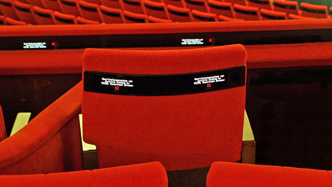 In bestimmten Bereichen des Theaters, wie der Peripherie oder einigen Sitzen in der Mitte, müssen zwei Displays in eine Sitzlehne eingebaut werden, da in der Sitzreihe hinter zwei Besuchern vom gleichen Sitzplatz vor ihnen gelesen werden muss.